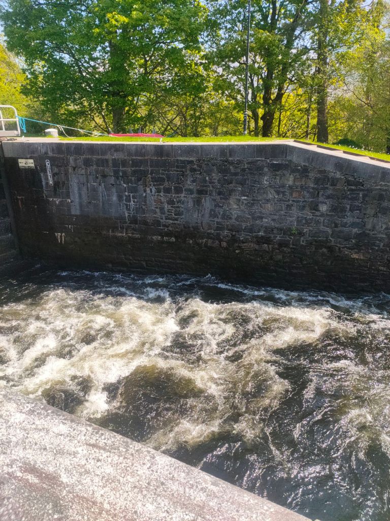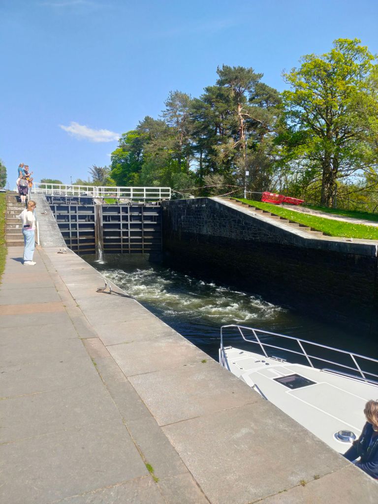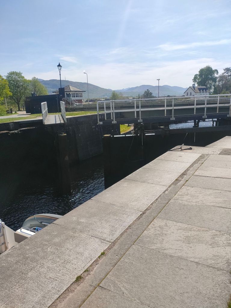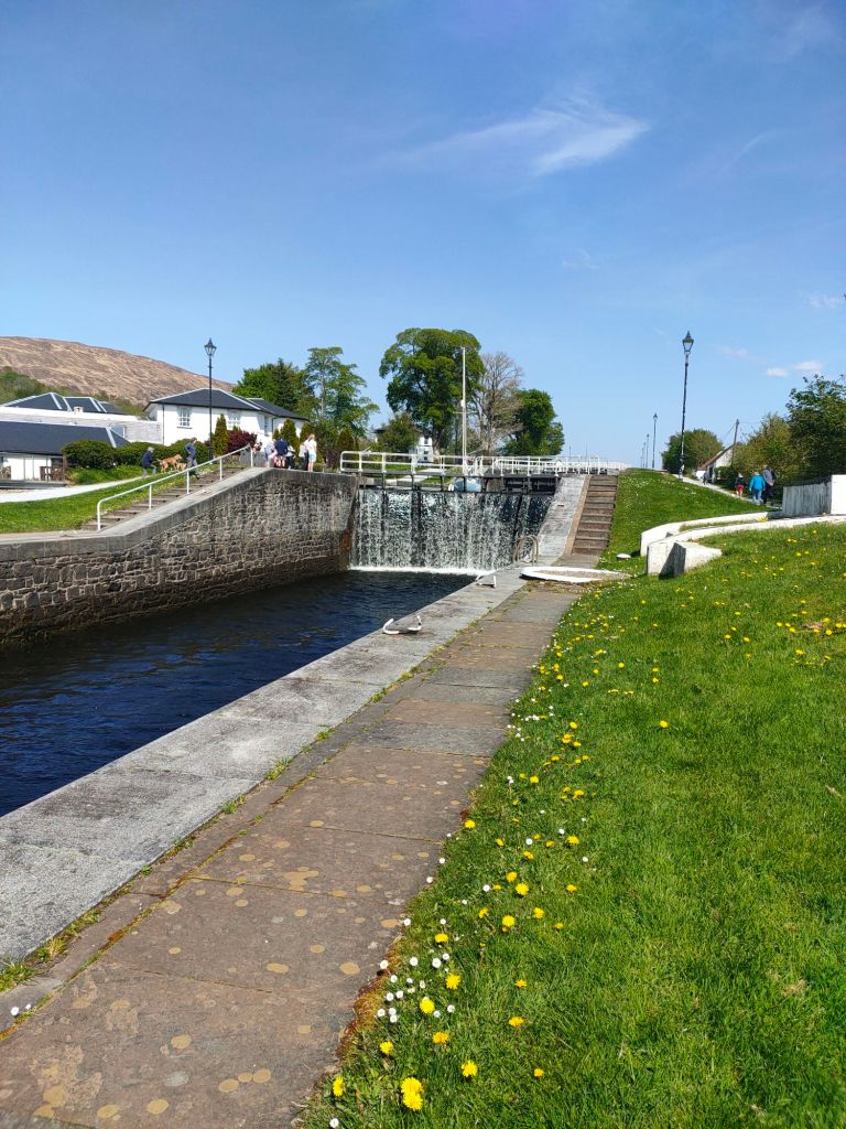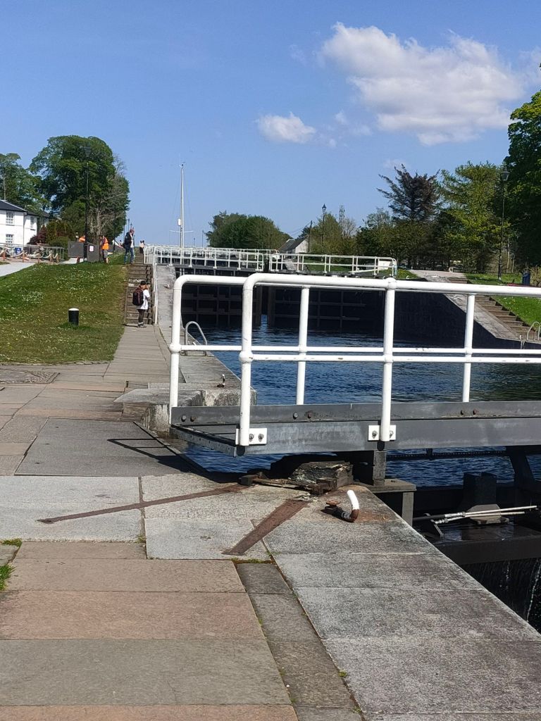 After waking up we head over to granny Kay’s for breakfast. We head to fort William we forgot to look out for a cool landslide. We then meet Elaine at Morrison’s and take a walk down High Street. Anyway we then try to go to Inverlochy castle which is pretty much a fancy hotel not what dad was expecting:( So we then go to Neptune’s staircase and no it’s not a staircase, it’s actually a canal but connects a high part of a canal to a low part with gates that act like stairs. When when we arrive there’s a sail boat going through and it’s going down the canal. Read the caption to see how it works.