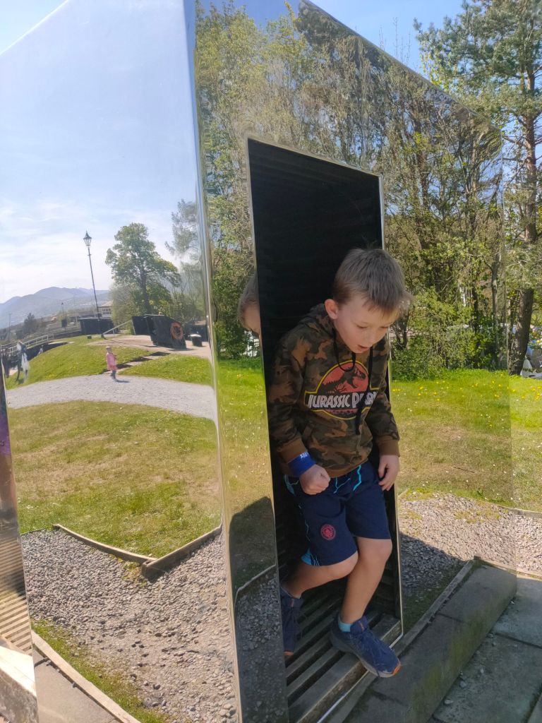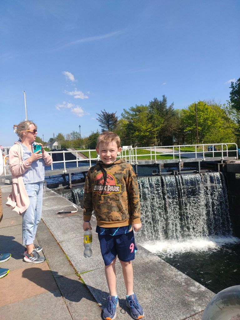 We also see it go through swing bridge which is a bridge that swings out of the way. Then we got to see a much larger boat do the same but go up the stairs which is still pretty much the same but in reverse. We then go to the top and start count all the sections. We then stop for ice cream. Logan gets bubblegum flavour, Ben gets Scottish tablet flavour same with Jackie, Dad gets Banoffee and Mum gets biscotti.