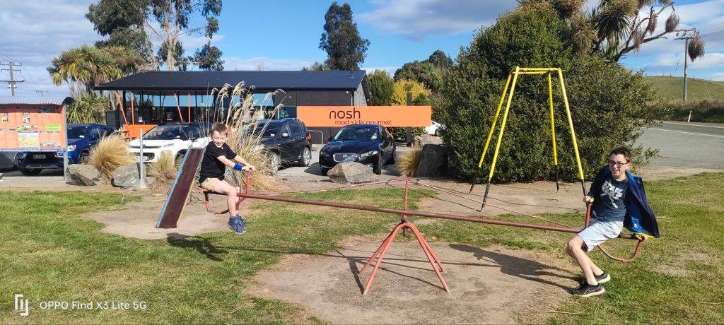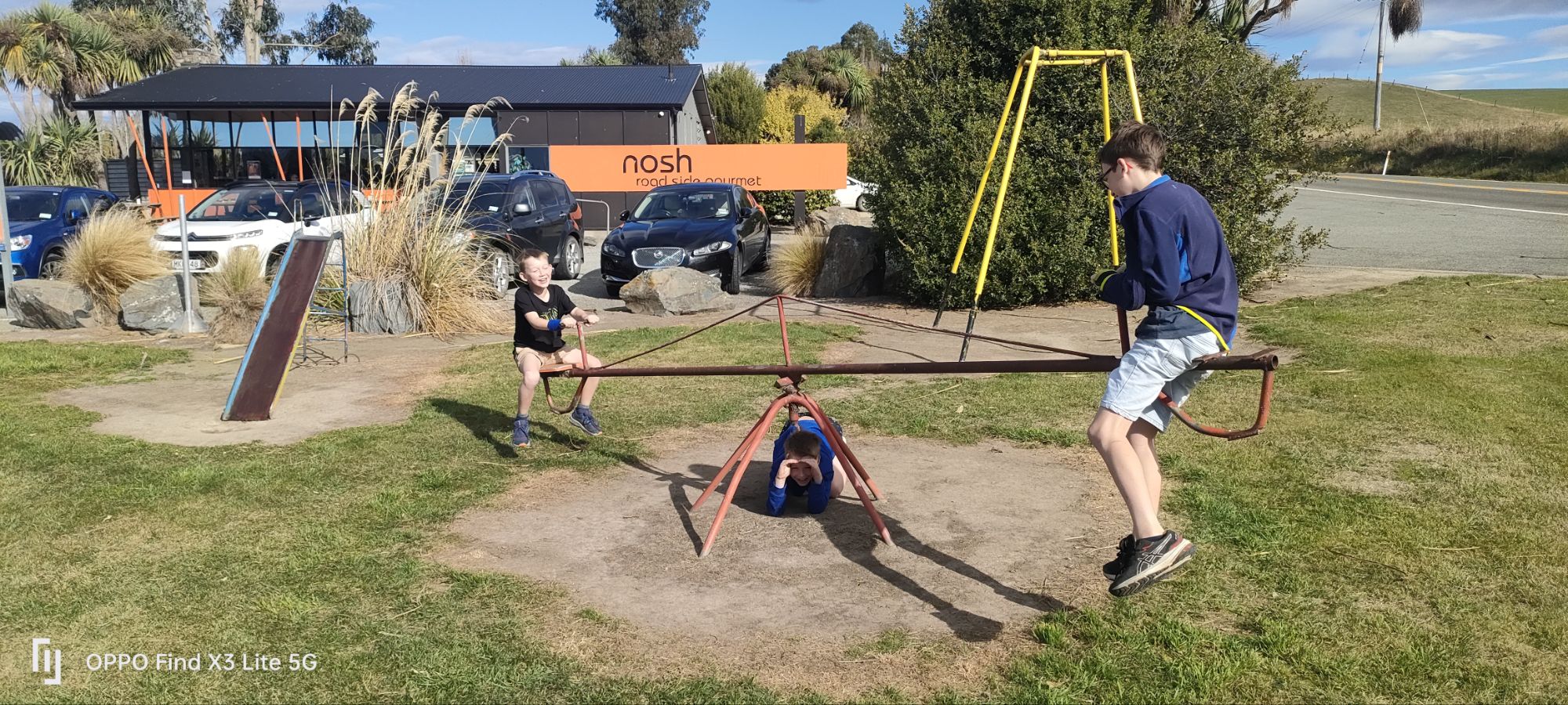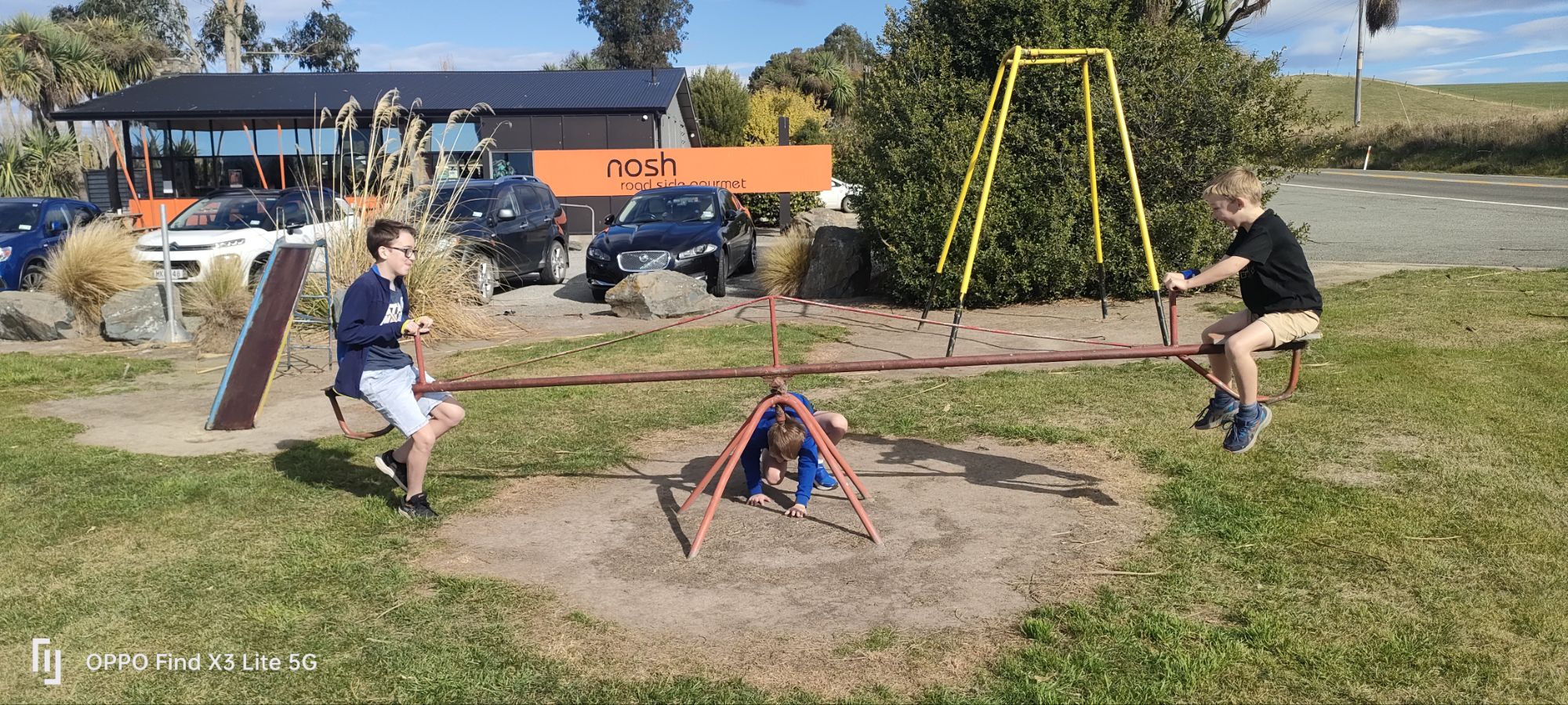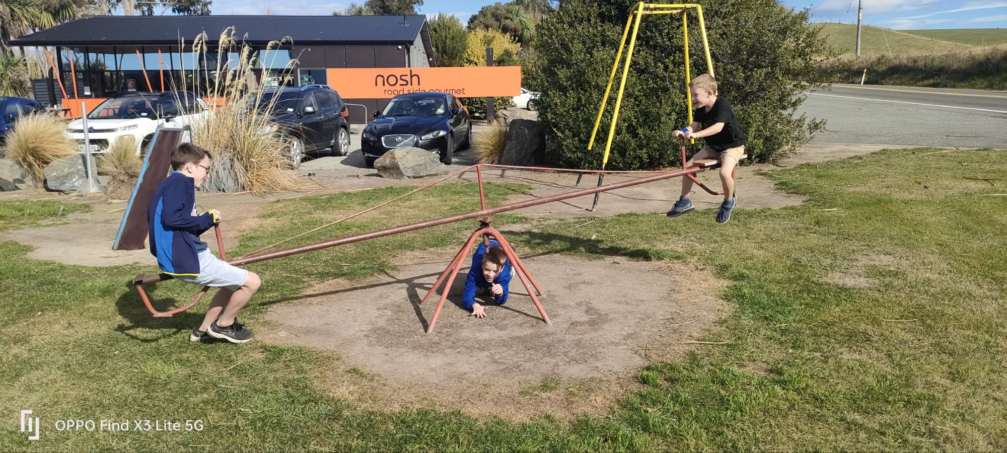 Cool playground. On the way to Christchurch dad needs coffee so we stop at Nosh for coffee and a play. On Jackie’s turn he fell off the funny thing hahahahahahahahahaha hahahahahahahahaha he was crying so much but he was ok after he stole some of dads caramel slice. Logan looks funny sitting on his shoes on the broken sea saw.