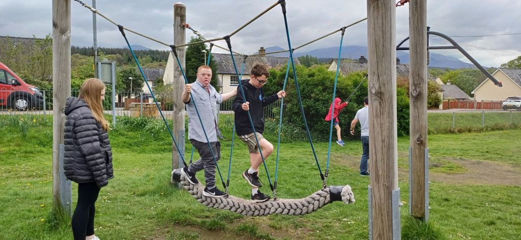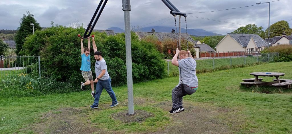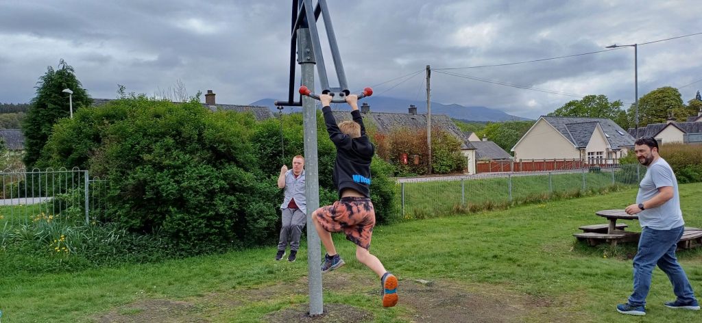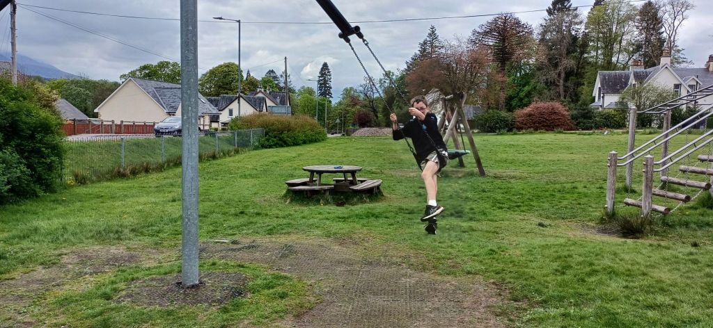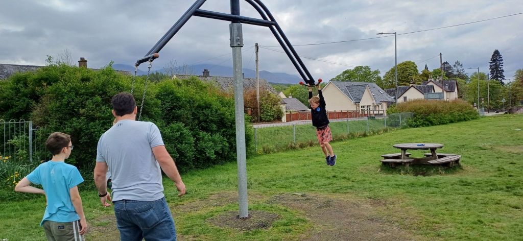 We wake up and head over to granny Kay’s house to say happy birthday to uncle Mark. We stay for a small bit to say hi and wish uncle Mark a happy birthday. We then get on the road with uncle Mark and Megan and just kinda explore. We see a playground in Spean Bridge and we stop to play but now it doesn’t look like the greatest playground in the world though it’s still really fun. In the centre There a swing but it spins around and on the other side of it there’s a handle its a bit high for me so only Dad can reach it. Dad pushed us on it and it was a tonne of fun. We also played busted.