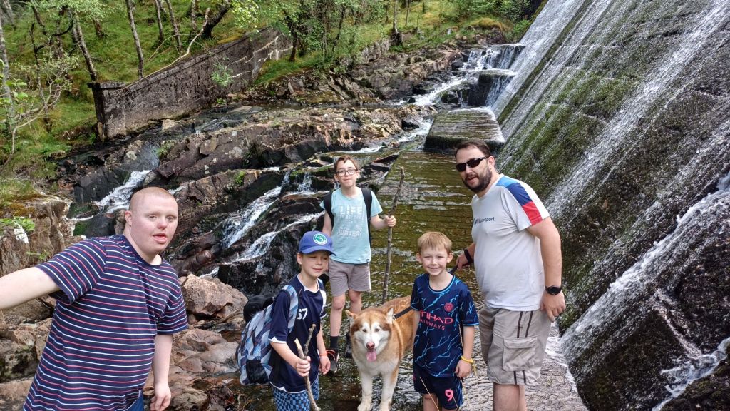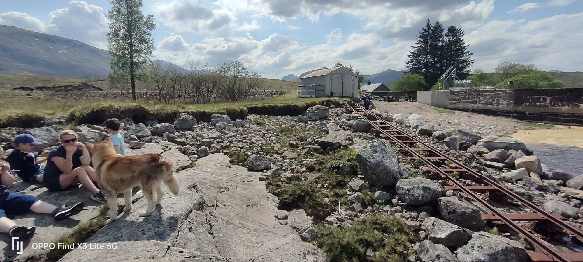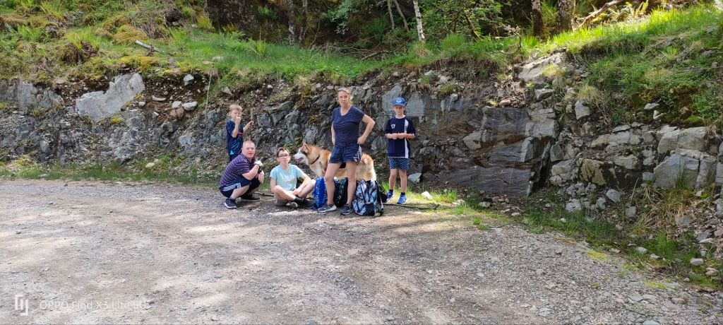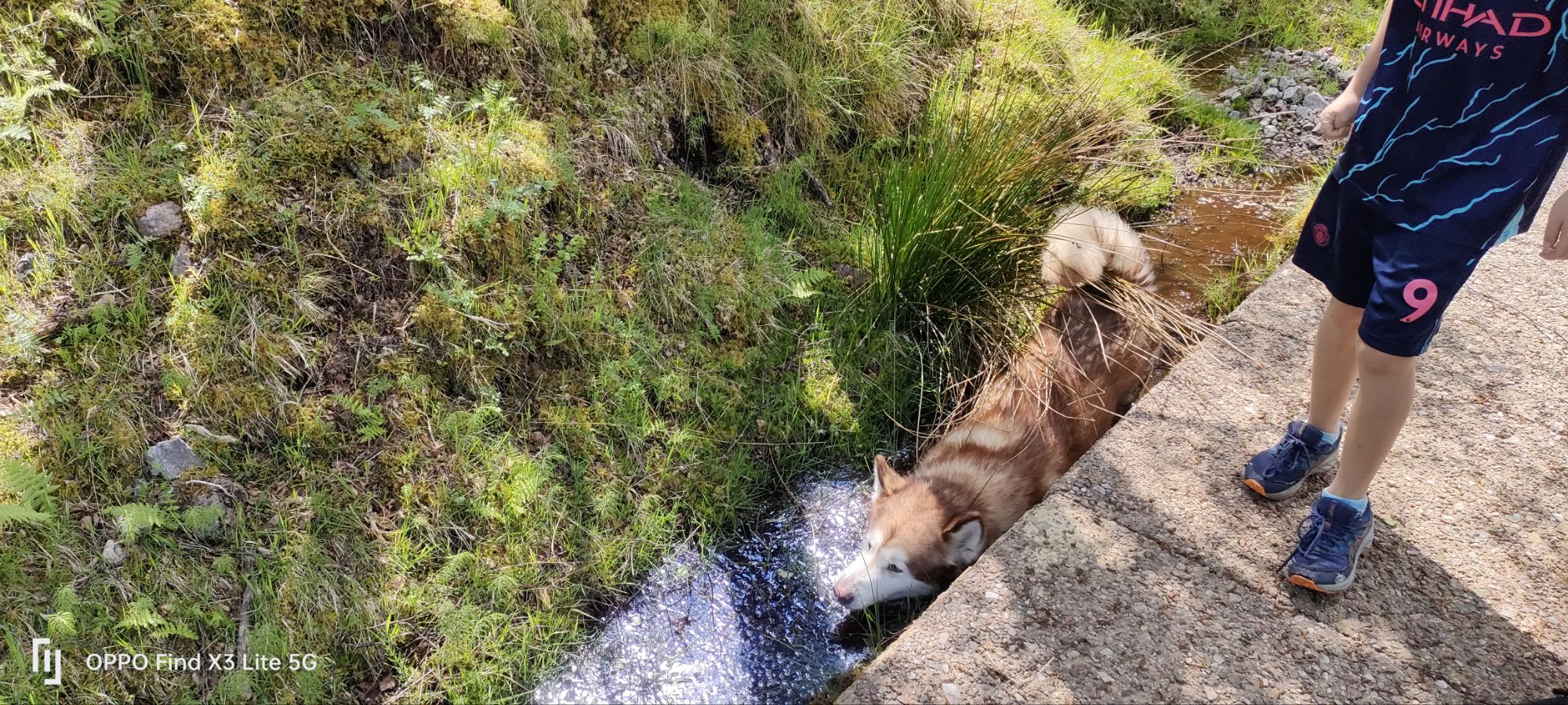 We then go up the steep hill but there are soooo many midges. See the penstalk. We go around the penstalk to the conduit we walk for a while until Asha jumps down a waterfall so Logan gets down to get her up. Me and Ben go around to help him. Ben tries to help by getting the lead but asha comes so Logan tries to get her back but falls over in the water and we get her back. We get to the end and follow the straight rocky path to the dam wall. At the dam we stop for lunch. me Logan Ben and dad go swimming in the water before heading back down the hill. On the way back Mark gets too tired to keep going so we stop at the penstalk and someone comes to pick him up but we keep going and make it back to the village. We chuck Asha in the river for a quick bath then head to granny Kay’s. Mark is super tired but ok